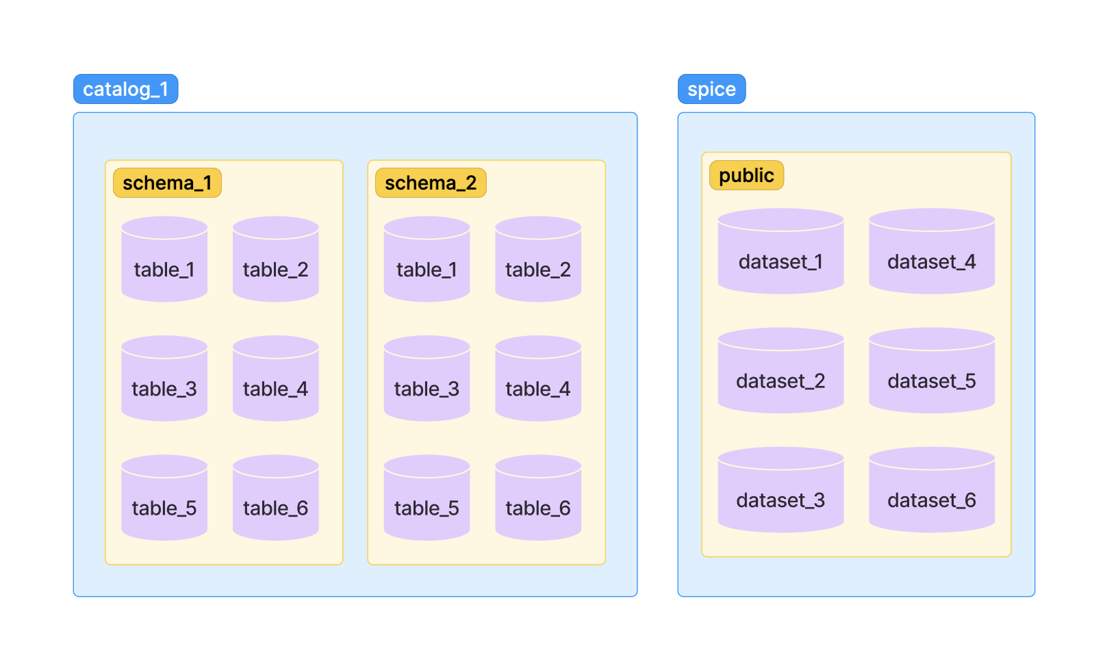 In Spice, datasets are organized hierarchically with catalogs, schemas, and tables. A catalog, at the top level, contains multiple schemas. Each schema, in turn, contains multiple tables where the actual data is stored. By default a catalog named spice is created with all of the datasets defined in the datasets section of the Spicepod.