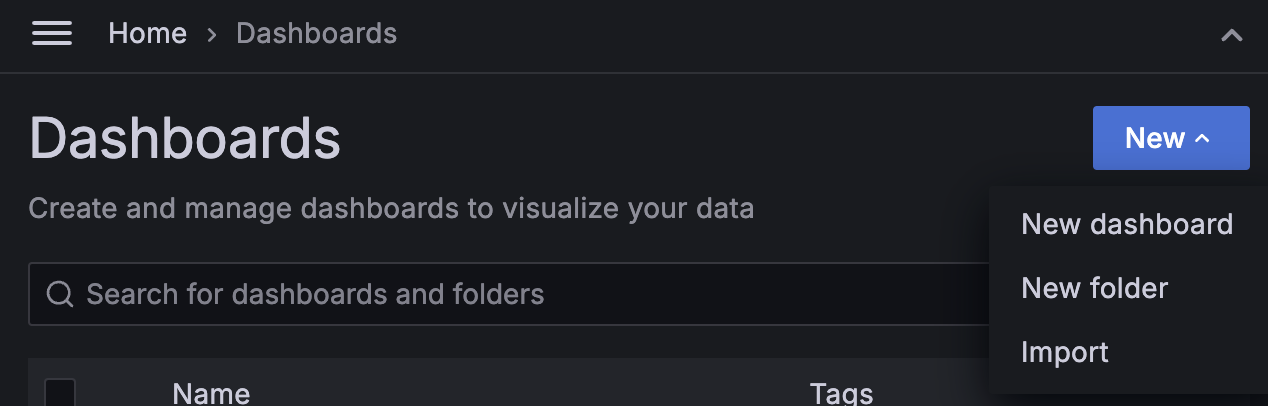 Navigate to the Dashboards section in Grafana and click "New" > "Import".