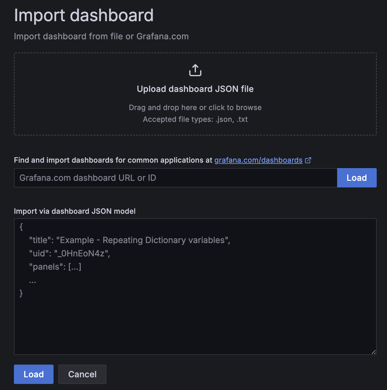 Copy the dashboard JSON from monitoring/grafana-dashboard.json into the Grafana import box.